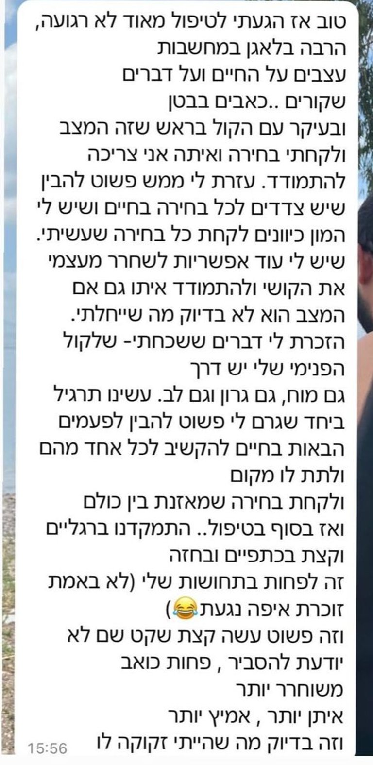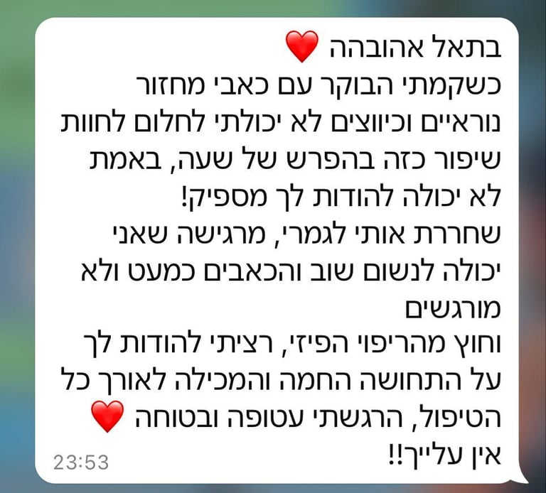 שמי בת אל ראובן אני פסיכותרפיסטית הוליסטית ומטפלת גוף ונפש, אני מלווה תהליכי ריפוי מתוך אמונה עמוקה שהתבוננות פנימית וחיבור רגשי הם המפתח לשלוות נפש ולבריאות הגוף. לאורך הדרך, הן במסע האישי שלי והן בטיפולים עם מטופליי, גיליתי שהיכולת להתבונן פנימה ולגעת בשורש מאפשרת לנו לחוות ריפוי עמוק – בגוף וברגש כאחד.