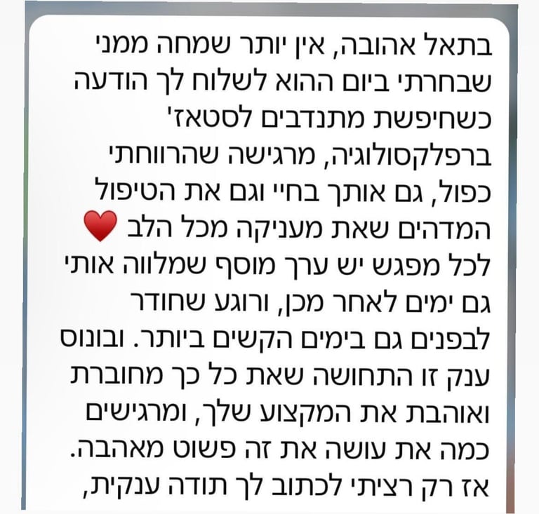 אני מציעה טיפול בכלים נרחבים מכל מני עולמות המאפשרים לראות את האדם בשלמותו, גוף נפש ורוח.